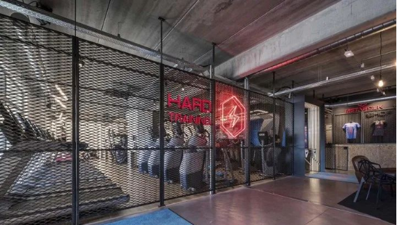 工業(yè)化的建筑裝飾風格,完美契合健身設施的氣質(zhì)要求。顆粒感的質(zhì)感隱藏了各種材質(zhì)和工藝要求的缺點,強調(diào)力量感和激情,刺激身體,爆發(fā)荷爾蒙。因此,工業(yè)設計與健身設施自然契合,成為近年來的流行風格。另一方面,對裝飾材料和造型技術(shù)的要求不高,可以有效管理預算成本,節(jié)省大量裝修成本。