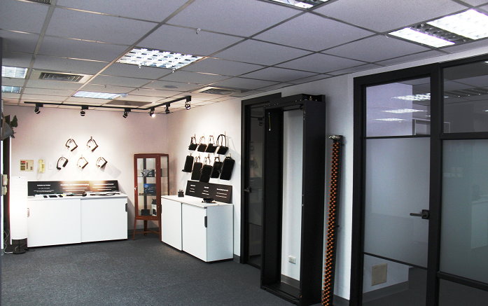 主題墻以深灰色為底搭配純白壓克力字體,造價(jià)較低但效果十足,減少固定式的展架,節(jié)省裝修經(jīng)費(fèi)、并把視覺的重點(diǎn)放在公司的產(chǎn)品上,讓產(chǎn)品變成空間的裝飾品。公區(qū)域?yàn)楫a(chǎn)品展示空間,為讓產(chǎn)品聚焦,因此不多做其它裝飾。