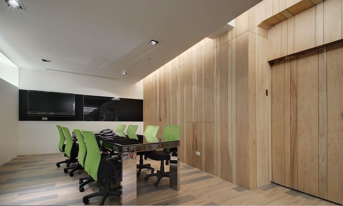 來到門口接待處,明亮鮮活的草綠色墻面讓人精神抖擻,同時也是企業(yè)標準色與空間的完美結(jié)合,借此讓來訪的客戶能夠?qū)ζ髽I(yè)留下活潑鮮明的第一印象。位于接待處墻面后方的是大會議室,設(shè)計師利用清玻璃搭配草綠墻面,作為會議室與接待區(qū)之間的區(qū)隔,同時兼顧了會議空間的隱私性與采光通透的需求,而借由清玻璃的視覺穿透效果,使會議室的木質(zhì)感主墻與前方綠色墻面形成呼應(yīng),帶來欣欣向榮的蓬勃朝氣。