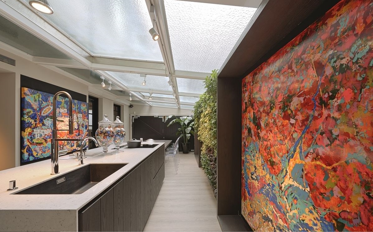 腦力刺激過后需要的是極致的放松,松弛有度才是讓創(chuàng)意源源不絕的長久之計,Idan沒有忘記要讓員工保持健康的身心,于是,走過如夢似畫的廊道,映入眼簾的是結(jié)合現(xiàn)代時尚的開放式中島餐廚區(qū),主墻是一大片延伸室外窗景的植生墻植披,天窗灑下的是令人羨慕的自然光,超大幅的畫作與綠墻一起環(huán)繞著質(zhì)地溫潤的會議長桌,即使再討厭開會,心情也會隨著飄散開來的巴西莊園咖啡香飛揚。