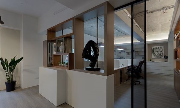 空間主要分為外部的接待休憩區(qū)與內(nèi)部的辦公區(qū)域,中間以具有視覺(jué)穿透效果的方形幾何造型墻與活動(dòng)式玻璃黑框拉門(mén)作為區(qū)隔,讓兩個(gè)區(qū)域各自保有獨(dú)立性質(zhì),同時(shí)又能維持寬敞的視野,而造型端景墻也具有展示功能,讓辦公室富有藝?yán)劝愕乃囆g(shù)氣息。