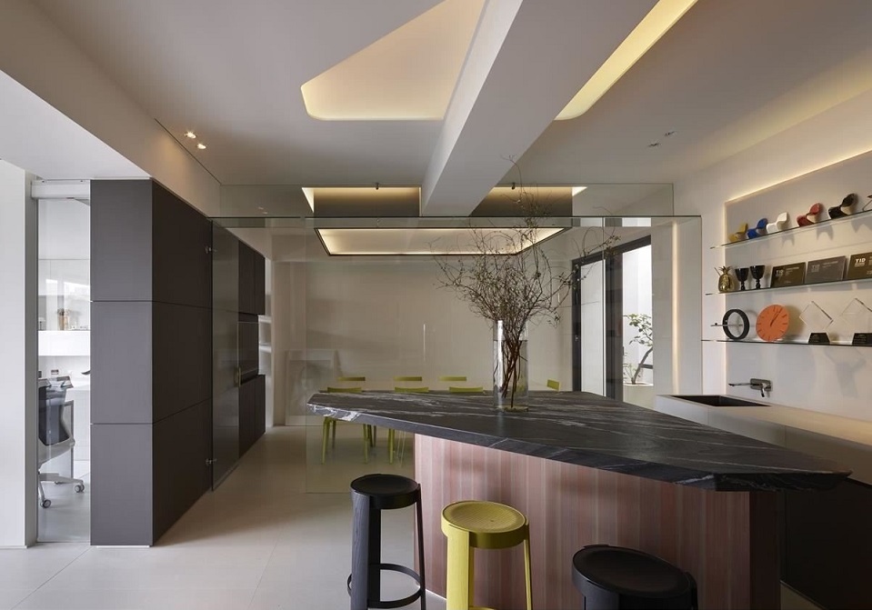 兼具接待、休息與會議的區(qū)域,擺放花崗石面、不規(guī)則切割的桌,讓空間、動線更活潑。