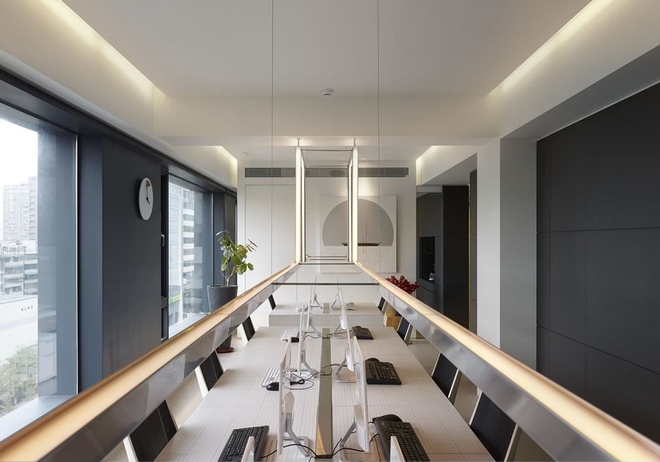 辦公區(qū)將鐵件LED燈置中,以墻面、窗景呼應,展現(xiàn)設計人對比例的極致追求與對稱之美。