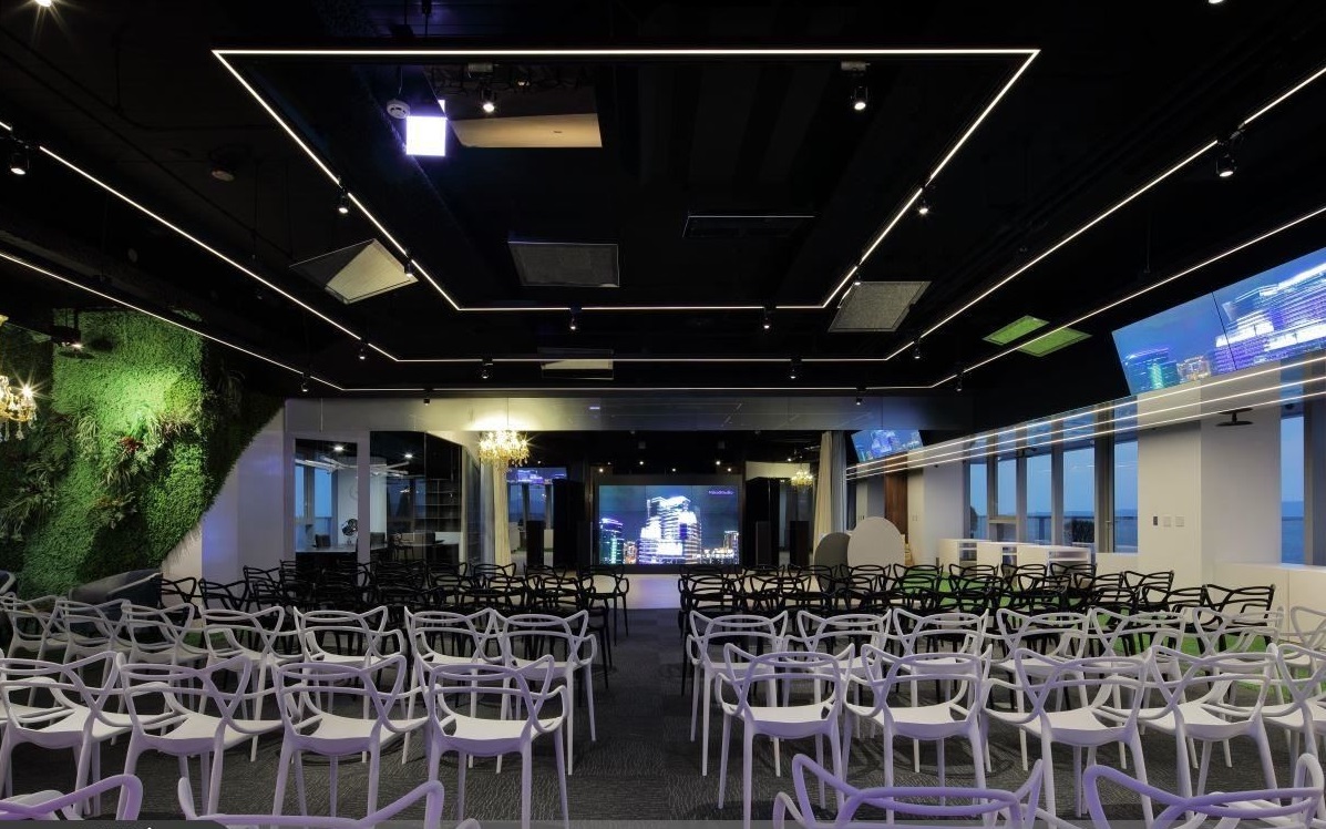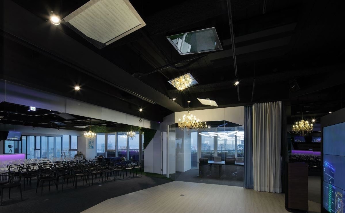 整個(gè)空間跳脫了格局的限制,設(shè)計(jì)師以大量不規(guī)則的線條語匯,包括多層次的線性光帶、噴黑的天頂結(jié)構(gòu)、管線等創(chuàng)造活潑視感,也達(dá)到視覺極致延伸的效果,連展演區(qū)座椅的采購,也選擇黑白雙色、并擁有鮮明線條造型、易于收納的款式,與現(xiàn)場的黑白灰階基調(diào)相呼應(yīng)。但除了沈穩(wěn)兼具個(gè)性的中性灰階之外,也不忘融入塊體、幾何元素的穿針引線,醞釀全區(qū)源源不絕的動態(tài)活力,像是一旁休憩區(qū)鋪設(shè)的人工草皮、用于重點(diǎn)端景立面的植生墻綠意、以及和整體現(xiàn)代簡約風(fēng)格強(qiáng)烈對比的古典水晶燈等等,都為空間感官帶來豐富的藝術(shù)養(yǎng)分!