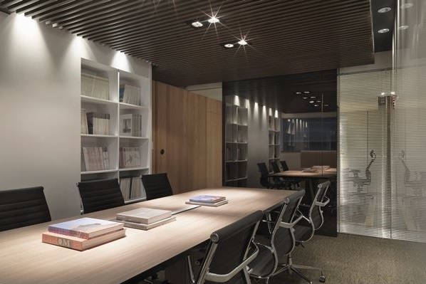 透過玻璃帷幕與鏡面的穿透特質(zhì),讓會(huì)議室的空間帶有延伸感,反射的視覺特性,更使空間有放大效果。多種材質(zhì)的混搭,為會(huì)議空間增添出時(shí)尚的美學(xué)氣息。