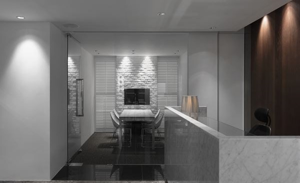 案例為商業(yè)空間,在 45 坪的有限空間,除了須有辦公區(qū)域、還需要 10 人、 5 人會(huì)議室以及茶水休憩等空間規(guī)劃,設(shè)計(jì)師打破原有的格局,利用玻璃帷幕與鏡面,打造出富有穿透視覺感的寬敞空間,也讓動(dòng)線層次更完整。此外,像是門口接待處,由于是公司對(duì)外的重要門面,為了營造出大器不失沉穩(wěn)的氛圍,設(shè)計(jì)師選用大理石作為柜臺(tái),后方則是深色木紋壁面,以經(jīng)典木石元素,強(qiáng)調(diào)出內(nèi)斂的質(zhì)感。