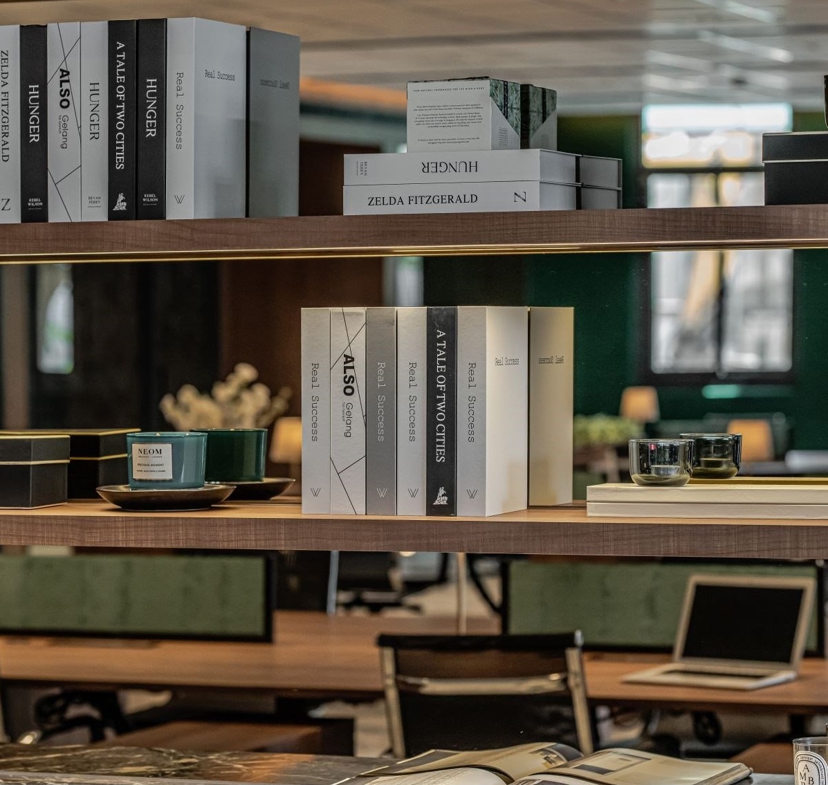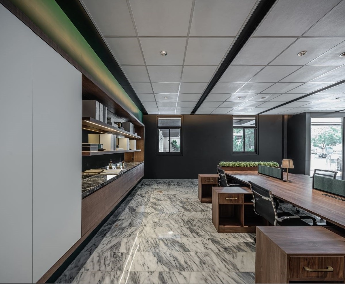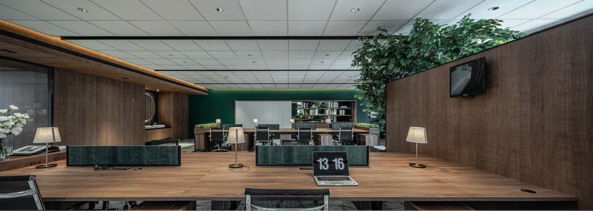室內(nèi)透過沉穩(wěn)的木質(zhì)主調(diào),打破一般辦公室給人的冷冽呆板印象,再佐以復(fù)古綠的大面積妝點,讓人有種歐洲百年飯店大廳的既視感,襯托出該企業(yè)的經(jīng)驗厚度與雋永內(nèi)涵。此外,設(shè)計師還刻意保留白色大理石紋地坪,在結(jié)合木質(zhì)與石紋等建材之后,表現(xiàn)出新舊交織的和諧視覺,并讓自然和人文在空間中優(yōu)雅共舞。