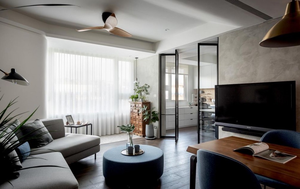 客廳邊獨立縫紉工作室不僅窗明幾凈,玻璃鐵框折疊門更讓居家生活與工作空間拉近距離,而開放餐廚區(qū)與大餐桌則可讓工作放松,也可轉換為工作討論區(qū)。另一案例為美甲店,舒適溫暖的居家布置與商品陳列相輔相成,也方便客戶挑選,而后方工作區(qū)則以波紋玻璃門來提高隱私性。