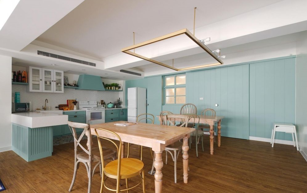 大大的鋼琴矗立客、餐廳之間,仿佛家就是舞臺,無論是工作或生活隨時都有浪漫琴音相伴,搭配著鄉(xiāng)村風空間風格更是唯美,而一旁羅曼蒂克的湖綠色廚房則增添清新氣息。為了滿足上課或發(fā)表會時有眾多學生、家長等乘坐需求,無論是客廳或餐廳教學區(qū)都有大量桌椅,而開放格局也讓空間更顯舒適。