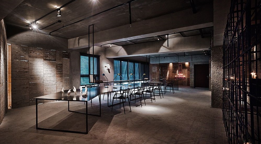 設(shè)計(jì)師利用板膜形塑辦公空間的基底,板模,是每棟建筑墻面在水泥未粉光之前的樣貌,粗獷且非秩序性,空間中則以交織的鐵件作為場(chǎng)域界定,最后再融入富于劇場(chǎng)張力的燈光計(jì)畫,板膜被不同的燈光刻劃出迥異的形貌,鐵件被燈光照射后倒映在地面、桌上的光影變化讓原本單調(diào)的辦公空間像攝影棚或舞臺(tái),隨著軟硬體改變而多采多姿,而人員在其中的活動(dòng)更有如登臺(tái)演出成為空間的一幕。