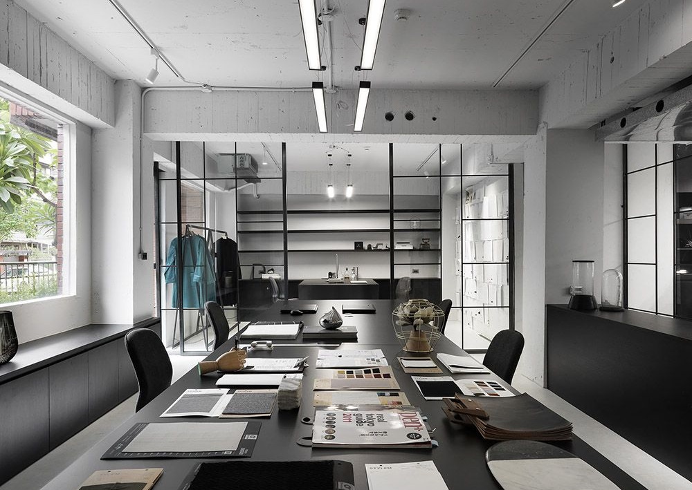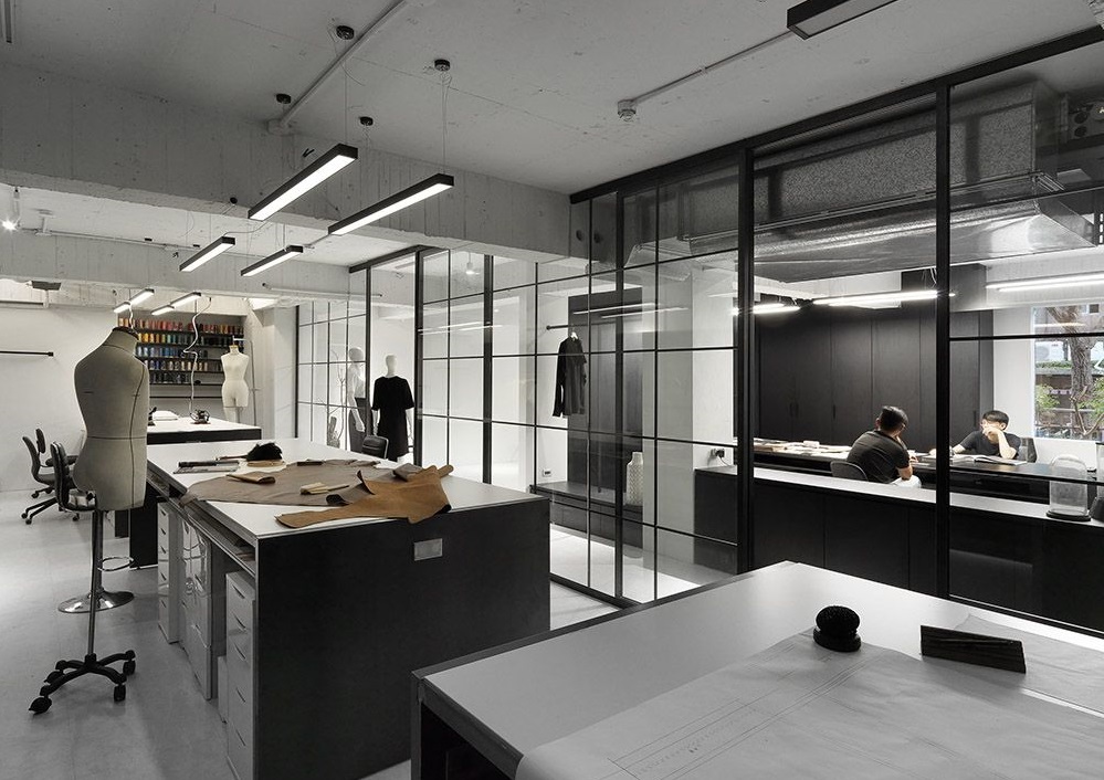 與辦公區(qū)以柱體與鐵件玻璃墻相隔的后方為縫制后區(qū),打版、剪裁、縫紉都在這里,此區(qū)透過縮短工作動(dòng)線距離讓流程更順暢。另外,通道也可作為服裝動(dòng)態(tài)拍攝的場景。
