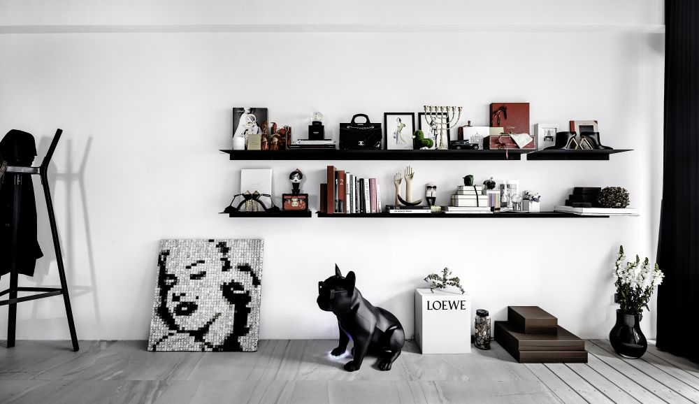 走進(jìn)空間,第一個映入眼簾的是延伸到陽臺的長廊,平時可當(dāng)走秀舞臺,將黑簾拉起便是一個小型攝影棚。中央辦公桌的折門背后是擺放時尚精品的地方,也設(shè)置了專業(yè)化妝臺,有如伸展臺的后臺一般。