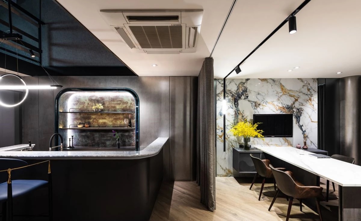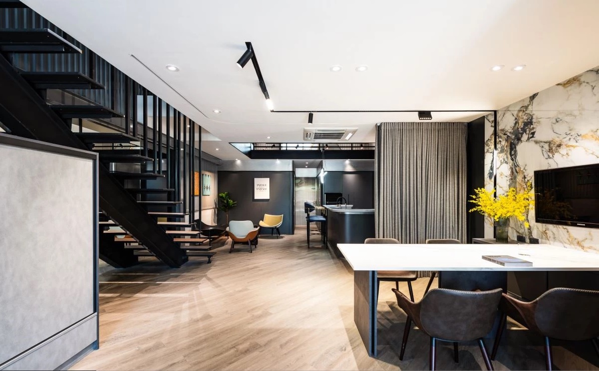 進(jìn)入辦公室沒有制式的柜臺,而是會客桌和展示區(qū),利用高挑的空間,安排前衛(wèi)的橢圓造型吊燈,充滿氣勢和意象。兩旁是廚具和衣柜等展示區(qū),考量到之后可能改變商品陳設(shè),墻面盡量以素面灰色調(diào)為主。中間天花較低的過渡區(qū),作為內(nèi)部開會區(qū)域,以大理石花紋美耐板位會議區(qū)鋪陳質(zhì)感。吧臺區(qū)運用復(fù)古元素和現(xiàn)代設(shè)計語匯,深綠色的美耐板帶出英式韻味。二樓是辦公區(qū),安排玻璃圍欄,遠(yuǎn)看辦公區(qū)好像懸浮在空間中,既呼應(yīng)主題,也有放大空間視覺感的效果。