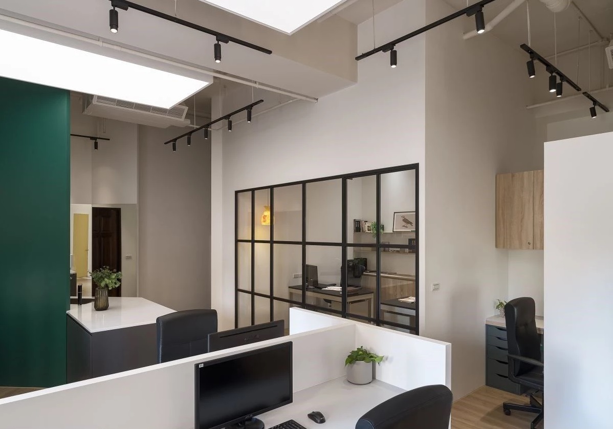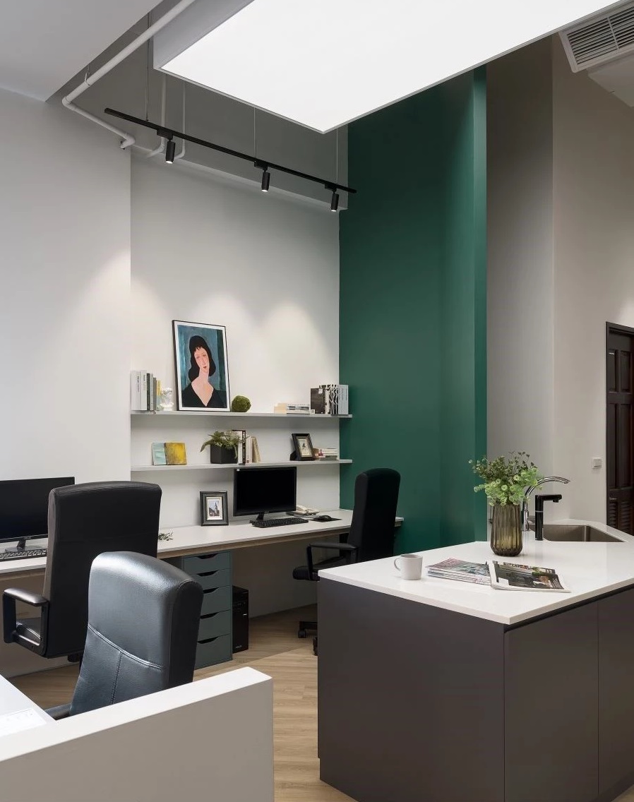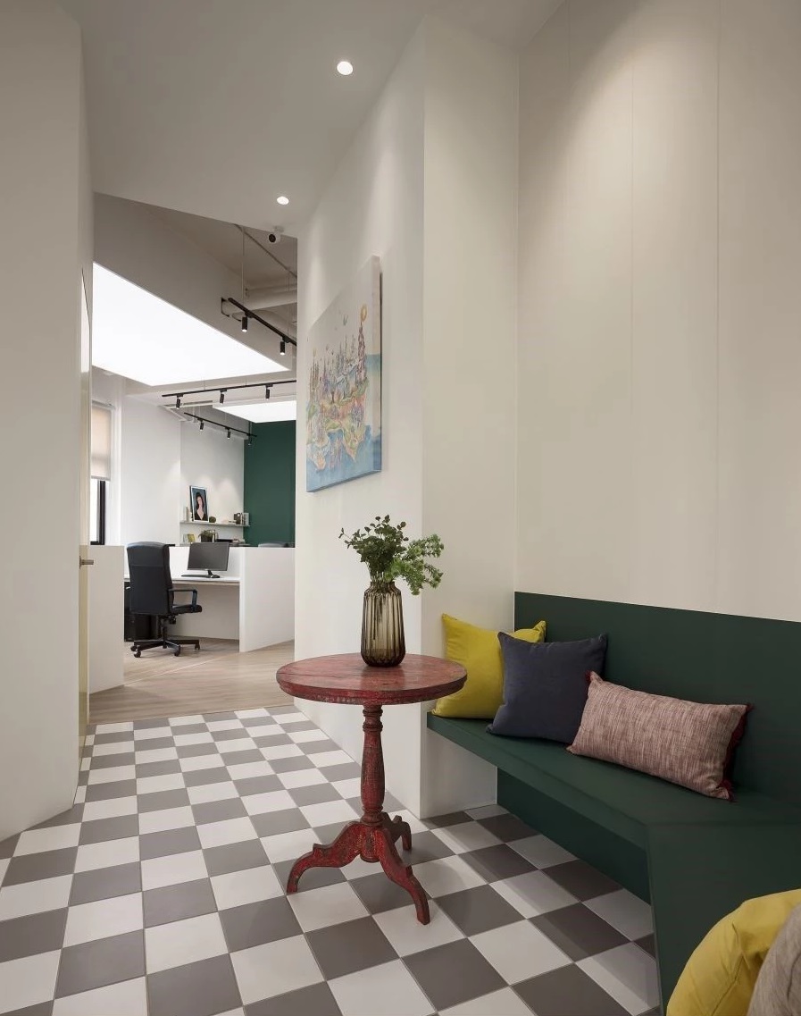 共同規(guī)劃的新辦公空間,有的總監(jiān)著重于動(dòng)線安排上,有的總監(jiān)則負(fù)責(zé)細(xì)節(jié)執(zhí)行,兩人也秉持相同的核心概念:“擺脫制式的辦公空間。”從入口進(jìn)入辦公室時(shí),迎來的斜切空間機(jī)能設(shè)定為玄關(guān)區(qū),但也可以轉(zhuǎn)換為會(huì)客室或同事休息放松使用,與主要辦公空間沒有阻隔卻又透過格局巧思替兩個(gè)領(lǐng)域帶來隱私,并巧用斜切面隱藏事務(wù)機(jī)及雜物,讓辦公室顯得俐落簡練許多。進(jìn)門處的黑白格磚搭配空間主色墨綠沙發(fā),攬美式氛圍的優(yōu)雅,跳色系沙發(fā)點(diǎn)綴,立刻揭開活潑亮眼的視覺序幕。入內(nèi)的辦公室整體色調(diào)帶點(diǎn)灰調(diào),注入沉穩(wěn)細(xì)膩的語匯;主要辦公區(qū)以黑白為主簡約感,保持俐落的專業(yè)形象。