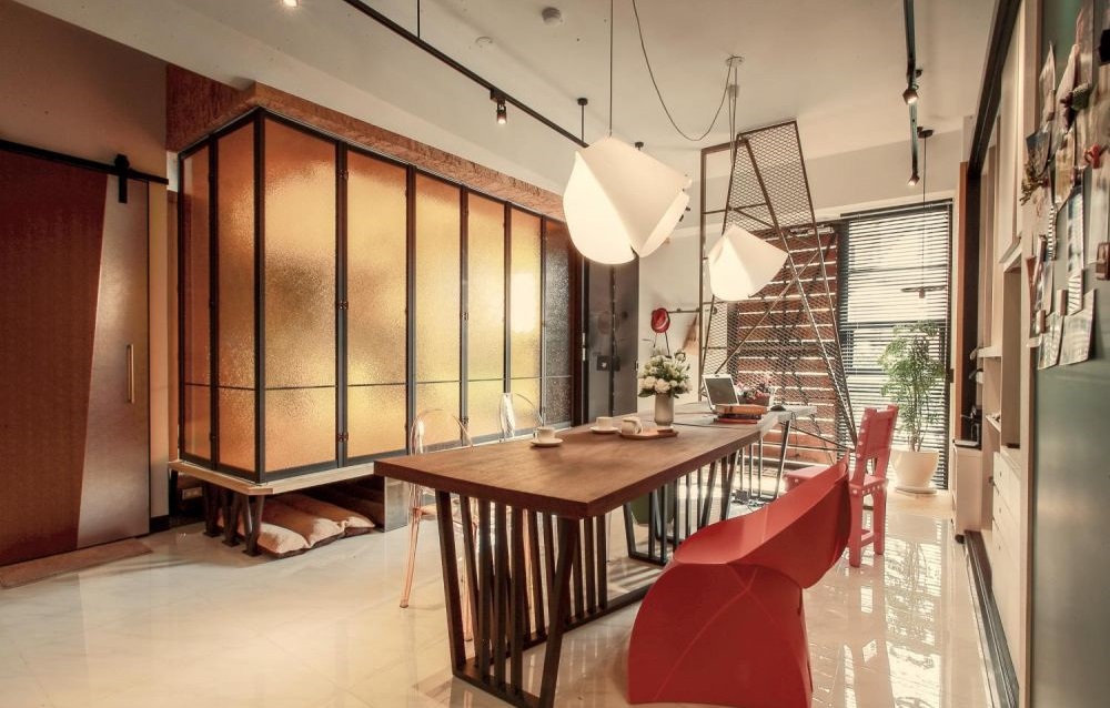 客廳邊獨立縫紉工作室不僅窗明幾凈,玻璃鐵框折疊門更讓居家生活與工作空間拉近距離,而開放餐廚區(qū)與大餐桌則可讓工作放松,也可轉換為工作討論區(qū)。另一案例為美甲店,舒適溫暖的居家布置與商品陳列相輔相成,也方便客戶挑選,而后方工作區(qū)則以波紋玻璃門來提高隱私性。