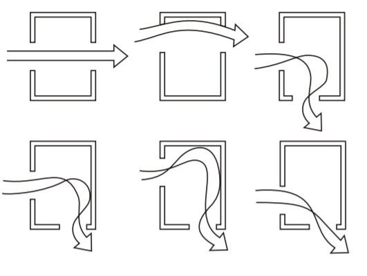 只要在室內(nèi)設(shè)計(jì)時(shí)調(diào)整風(fēng)口的位置,就能利用自然的空氣流動(dòng)改善室內(nèi)溫度。設(shè)置窗戶與門(mén)的位置會(huì)影響空內(nèi)氣流。上圖展示了不同對(duì)流風(fēng)的效果,當(dāng)中把門(mén)和窗設(shè)置在對(duì)角的話,能營(yíng)造較大也較寬的對(duì)流風(fēng),該區(qū)域就會(huì)有足夠的風(fēng)來(lái)降溫。