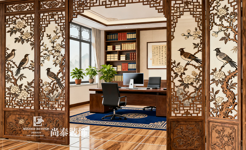 國風辦公室裝修需兼顧 “文化底蘊與功能實用”,尚泰裝飾擅長將傳統(tǒng)元素現(xiàn)代化。其經典方案為:墻面局部采用中式屏風(可定制公司文化圖案),其余區(qū)域刷朱砂紅或墨黑乳膠漆,地面鋪仿木紋瓷磚,搭配中式地毯。
