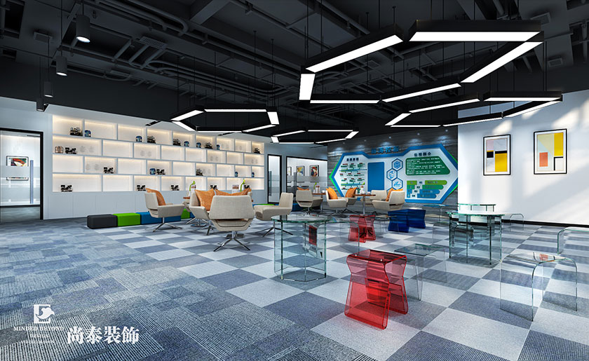 前廳作為對(duì)外的第一接觸的地方,帶給人最直觀的感受。大篇幅背景墻面,強(qiáng)化背景,突出公司的類型、風(fēng)格,天花采用圓形造型燈膜吊頂做出科技感,地面采用釉面瓷磚,通過(guò)光線的漫射直射來(lái)凸顯重點(diǎn)。