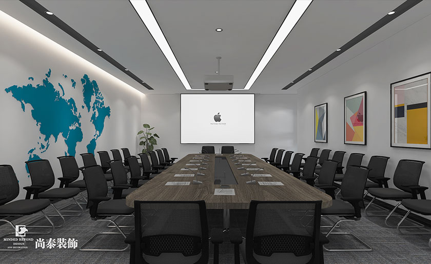 會(huì)議室的展示是僅次于前廳的位置,主要是針對(duì)大型會(huì)議以及大型參觀團(tuán)隊(duì)的會(huì)議場(chǎng)地,同樣也是對(duì)外的形象傳播。在滿足功能的同時(shí),利用天花造型和墻面造型來(lái)提升大會(huì)議的檔次。