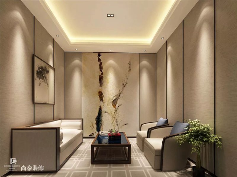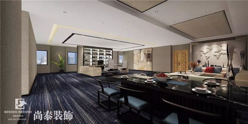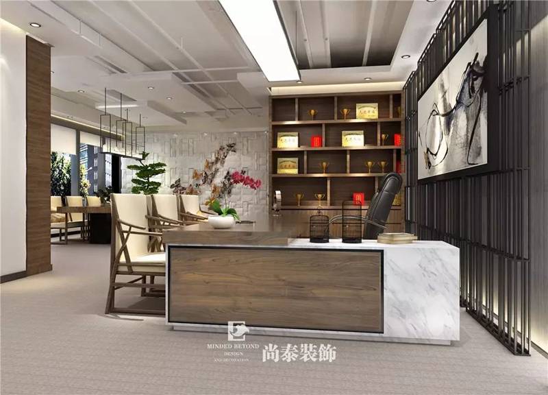 辦公室通過一定的設計手法巧妙地把中式風格和現(xiàn)代材質兼揉在一起,讓它們相互輝映,中式“留白”的意境富有藝術內涵。
