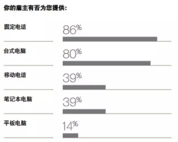不僅如此,在辦公設(shè)備方面也不如我們想象的那樣改變了那么多。近年來,個人移動設(shè)備的使用率越來越高,印象中在辦公室里的應(yīng)用也愈發(fā)普及,甚至有些人認為移動設(shè)備的使用率可以占據(jù)半壁江山,但在報告中我們卻發(fā)現(xiàn):固定辦公設(shè)備遠高于移動設(shè)備的使用,固定電話和臺式電腦的提供率是移動電話和筆記本電腦的兩倍多。
