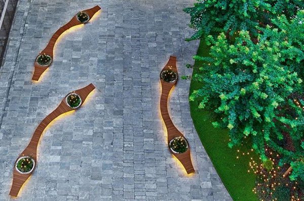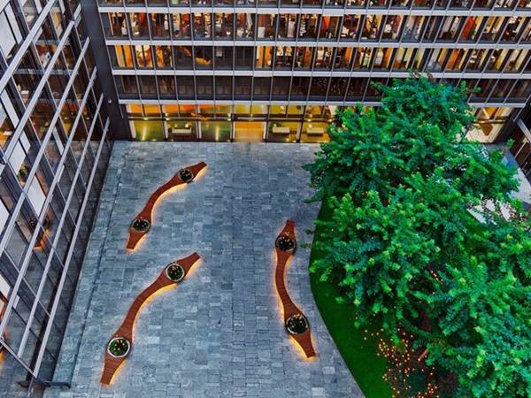 驅(qū)動主庭院的石頭鋪路是由景觀顧問定制的長凳。 它們的有機形狀和圓形植物結(jié)合起來,這些植物是本地采購的相思木。 場景布置的如詩如畫,一個長凳坐落在一片綠色的島嶼旁邊,一片綠草如茵的草坪,發(fā)芽的樹木,灌木和發(fā)光的螢火蟲。 “我們非常關(guān)注室外的環(huán)境,人們出來打電話,呼吸新鮮空氣,小憩。”他說。 “工作壓力越大,越需要平靜和自然的環(huán)境?!?/p>