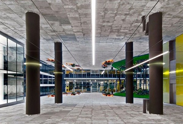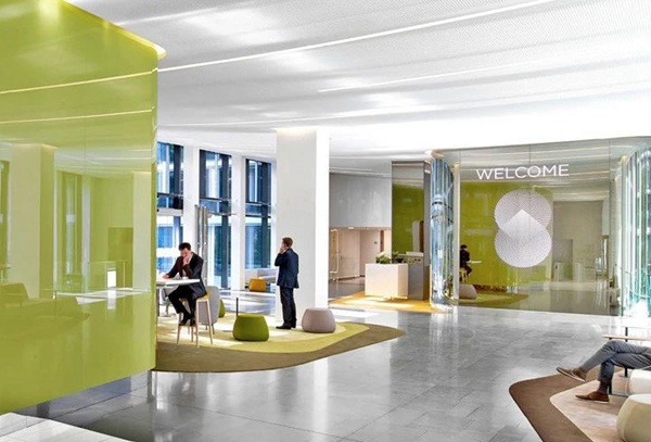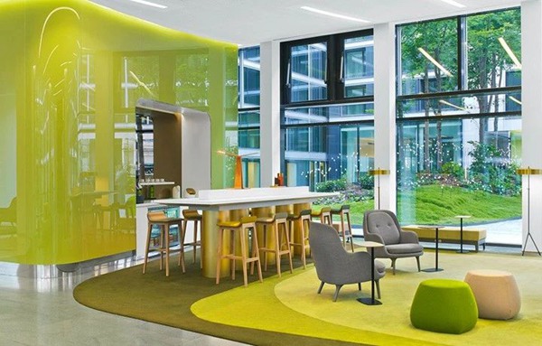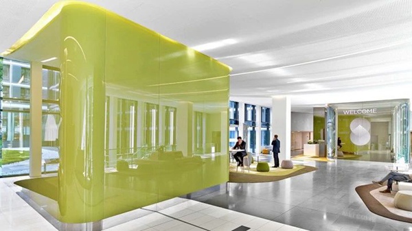 在內(nèi)部,調(diào)整了幾個庭院的地面布局,以改善服務(wù)流程,比如增加一個24/7的服務(wù)臺和三個內(nèi)部餐廳。 為了重新配置主庭院遠側(cè)巨大的大廳,他建立了幾個自由漂浮的區(qū)域。 大廳連接處的部分被明亮的綠色玻璃包圍,實際上是巨型屏幕,可以編程顯示實時新聞,天氣或公司信息。 他把這些玻璃元素稱為“數(shù)字冰塊”。