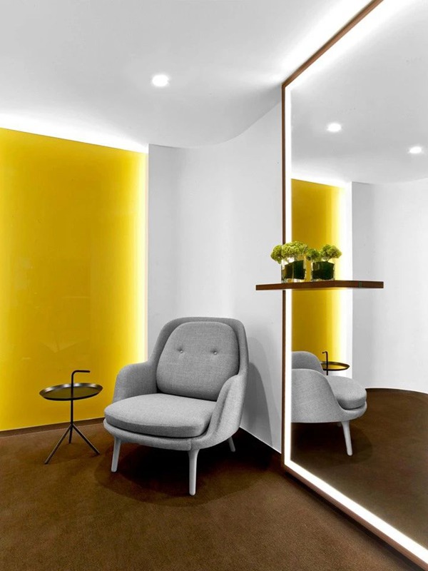 為了平衡大廳的線性線條和冰冷的大理石,金屬和玻璃的冷峻,他為多個區(qū)域配備了座椅,包括帶軟墊的宴會椅,扶手椅和腳凳,還包括大量電源插座和充電器。 “公共空間的氛圍應(yīng)該是豪客的,活潑的,自由自在的,”他說。 自助咖啡吧提供各種報紙和雜志,還有一個小型的“美容休息室”,配有閃亮的化妝鏡,有助于營造一個寧靜的氛圍。