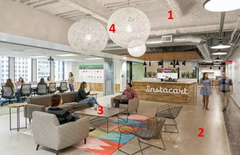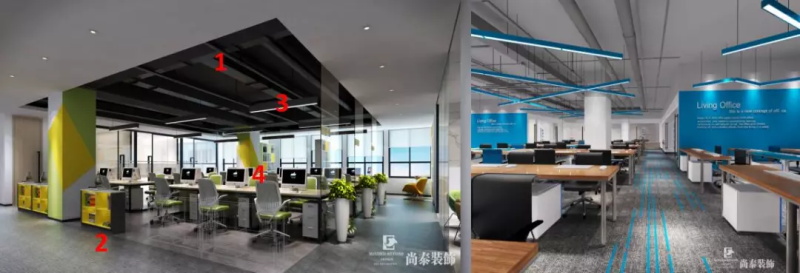 開(kāi)放辦公區(qū)域作為整體員工工作區(qū)域,保證員工舒適性,提高工作效率,天花噴灰色漆,