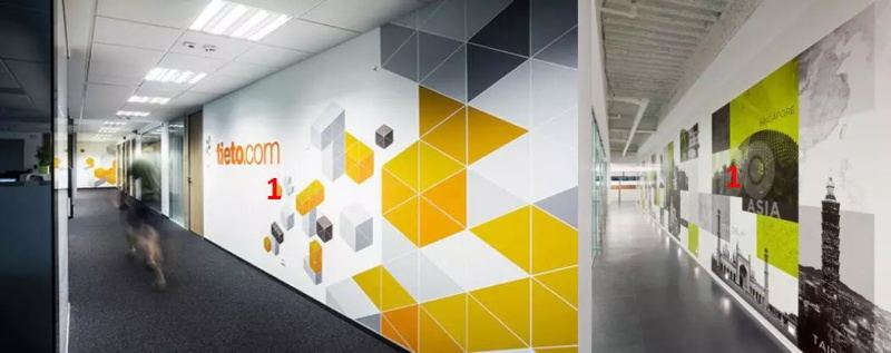 辦公區(qū)的過(guò)道墻面主要采用顏色的組合形式,豐富整個(gè)空間的氛圍,人的視覺(jué)也能夠得到緩解。