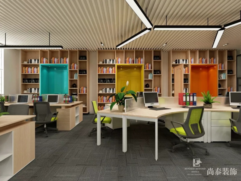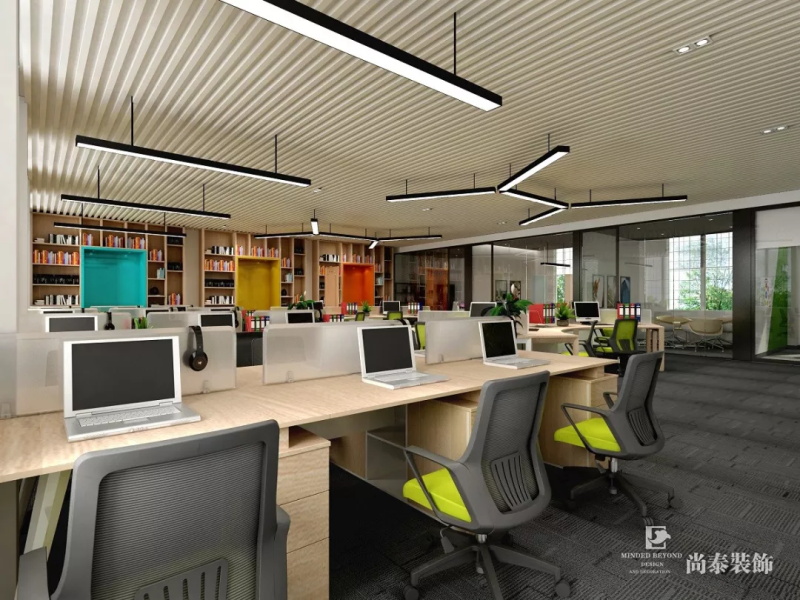 本案作為現(xiàn)代簡約時尚風(fēng)格的網(wǎng)紅直播IT辦公室,尚泰裝飾的設(shè)計定位即是簡潔時尚與科技感,通過部分鮮艷的軟裝搭配結(jié)合天花燈光效果,營造出一個現(xiàn)代感極強(qiáng)的辦公氛圍。