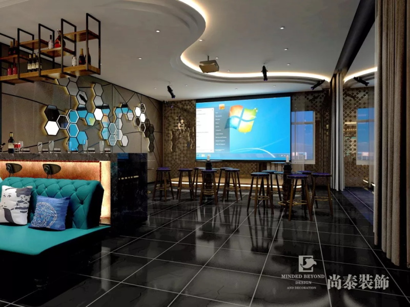 哪怕是在夜晚,都能讓人眼前一亮;吊頂天花的設(shè)計,通過線條感來體現(xiàn)科技感,墻面與天花大部分的刷白,