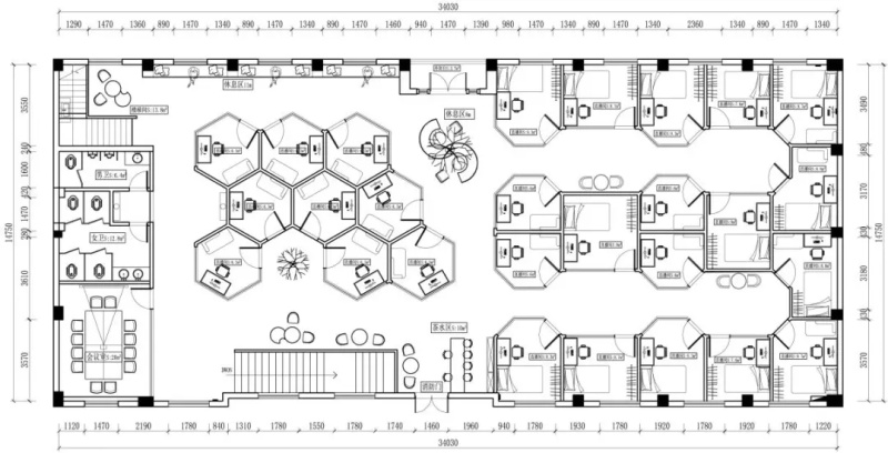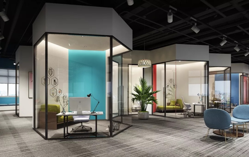 二樓直播區(qū)域,尚泰裝飾設(shè)計團(tuán)隊采用仿生學(xué)的蜂窩概念,通過玻璃材質(zhì)與顏色的運用,將各個直播間逐一的區(qū)分開來,