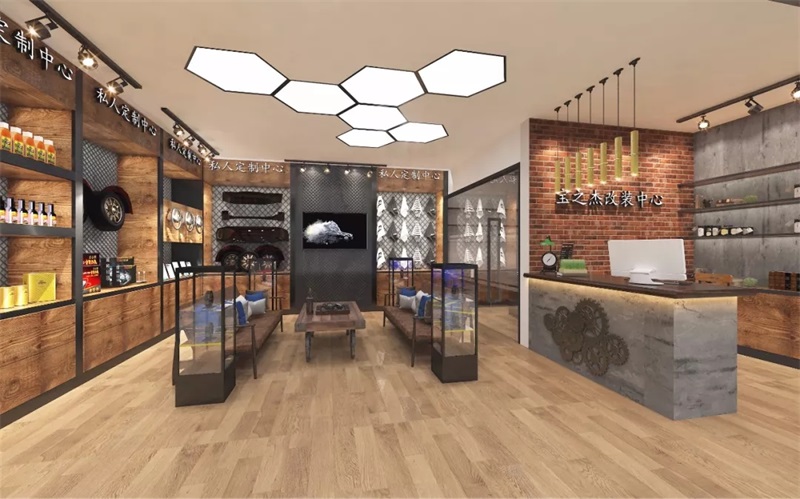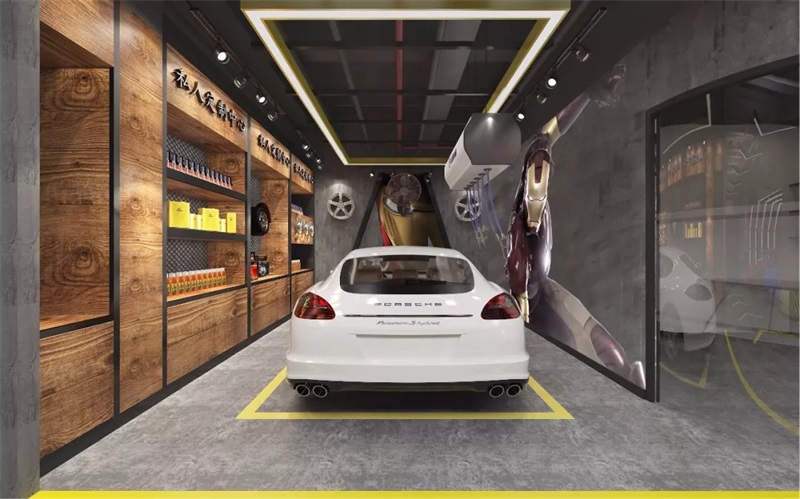 本案中的汽車改造店是一家主要針對(duì)年輕人對(duì)汽車改造的狂熱喜愛,少數(shù)年長(zhǎng)的,但是整體風(fēng)格要粗獷,所以設(shè)計(jì)定位是在工業(yè)風(fēng),在整體設(shè)計(jì)中,著重采用了灰色調(diào),地面墻面水泥灰加上柜子黑色不銹鋼收邊,墻面局部造型采用了裸露的紅磚造型,在墻面還噴繪有鋼鐵俠的造型,使整個(gè)空間增添了亮眼的部分。