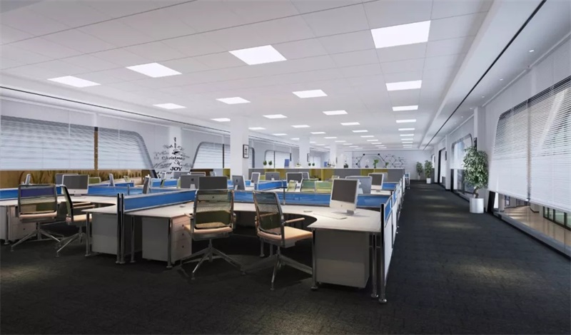 辦公區(qū)天花噴灰色漆,天花用黃色和白色的燈裝飾,墻面沒有過多的造型,整體營造的氛圍很和諧。