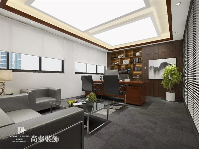 總裁辦公室定制了簡約現(xiàn)代的家具,天花做了平頂和少部分的造型邊頂,整體突出現(xiàn)代簡約的理念。
