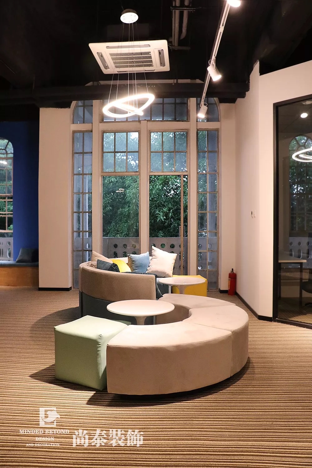 ▼這個角度,可以看到,半圈藍色長凳,圍繞著內部,可以近距離的交談,打破人與人之間的距離感,提高工作效率。