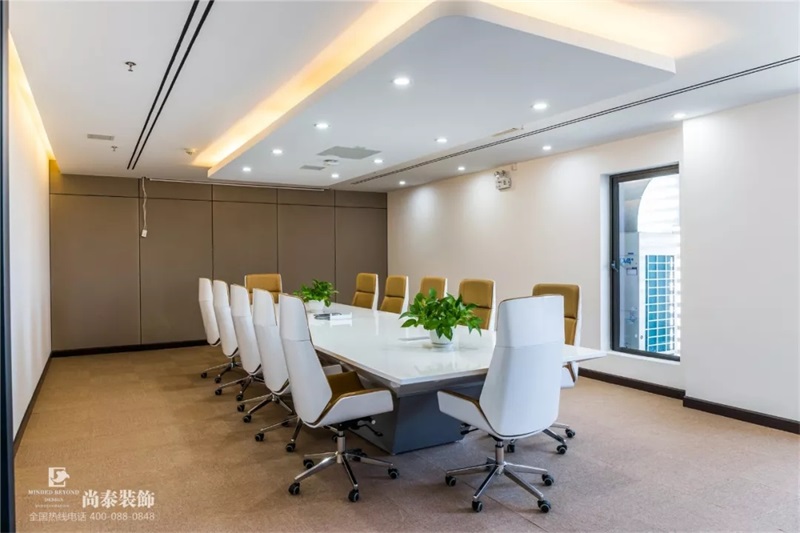 地面使用棕色的地毯來穩(wěn)定空間的作用和減低在開會時候人員的出入的聲音。把投影藏在天花上面,在需要使用的時候才放下來,靠窗的采光使室內(nèi)和室外都相互連接在一起,但是又能相互的分隔這空間,因此裝飾較為簡單。