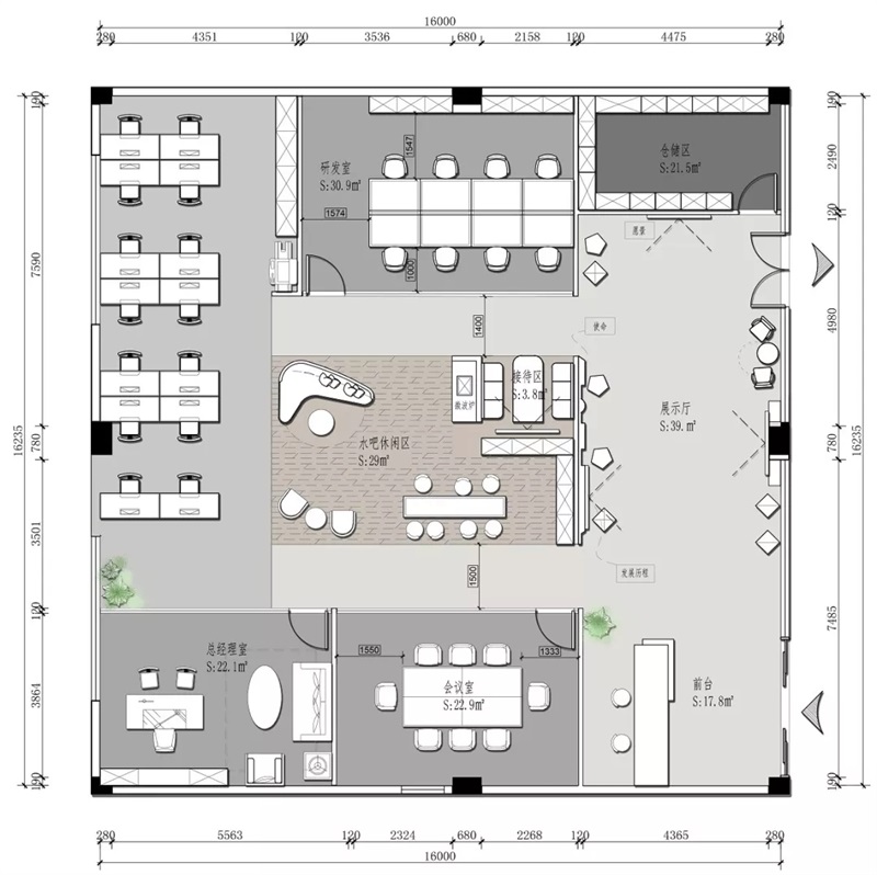 項目的設計結合企業(yè)可持續(xù)發(fā)展、綠色經(jīng)濟、企業(yè)文化、人文環(huán)境、研發(fā)產(chǎn)品,契合科技感與現(xiàn)代簡約的辦公設計思路。