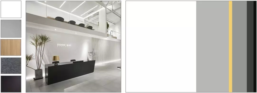 空間整體色調(diào)以黑、白、灰為主,局部采用跳躍色進(jìn)行點(diǎn)綴,配合冷色系列的燈光,營造明朗舒適的氛圍,突出科技時尚感,讓整個空間更具靈動性。