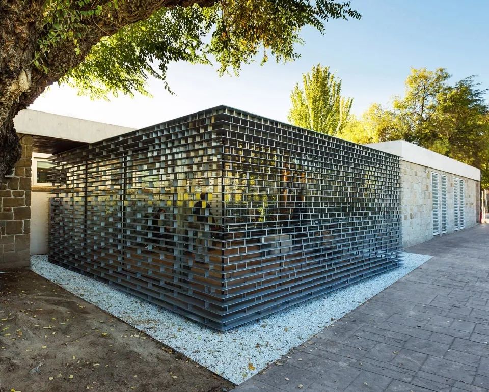 這座涼亭位于西班牙一棟行政大樓的開放式后院中,設計師想將現(xiàn)有建筑與自然環(huán)境完美地融合在一起,于是設想了一個簡單的由玻璃圍合起來的方形盒子。這座酷似格柵形式的涼亭由水平和垂直的鋼片組成,內(nèi)部用透明的玻璃將空間圍合起來,在保護了室內(nèi)私密性的同時還保持了空間的通透性,兩全其美了。