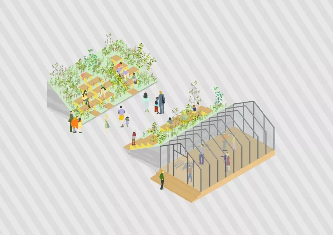 這個辦公室具有一個具有綠化表皮的階梯狀的長椅,除了為辦公人員提供休息功能之外,還作為城市長椅來使用,城市里的任何一個人都可以使用,這大大加強了該辦公裝置與環(huán)境的聯(lián)系,辦公人員可以在這里開會議、曬太陽休息,還可以和市民們聊天,這真的是太棒了!