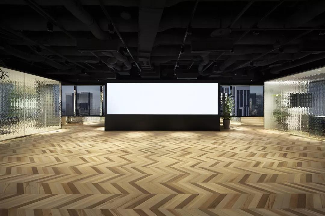 本案McKinsey東京辦公室裝修,辦公室的天花板全部做了噴黑處理,地板采用木紋裝飾,一面黑硬一面柔和,兩者形成強烈反差,隱藏和突出。天花板的原始線條被隱藏起來,其余的空間被突出顯示出來。
