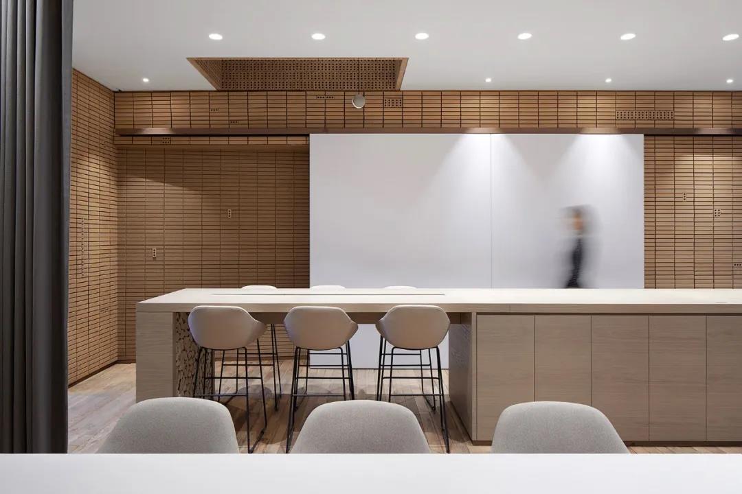 磚墻從一樓延伸到二樓,使得較為狹窄的門戶更具有立體縱深感,形成空間中的視覺焦點(diǎn)。茶水間的磚墻又與其他的不同,相同的大小,統(tǒng)一樣式地整齊排列著,形成平整的空間紋理,沒有凹凸不平,看上去更為精致、細(xì)膩一些,給人傳達(dá)出溫暖細(xì)致的品牌質(zhì)感。茶水間整體吧臺設(shè)計是隱藏式的,想象不到的是,水槽、垃圾收納、冰箱、烤箱、會議線槽等功能都在這里面進(jìn)行了融合。這樣的設(shè)計既提高了整體空間的視覺美感,又實(shí)現(xiàn)了多功能的使用情景。