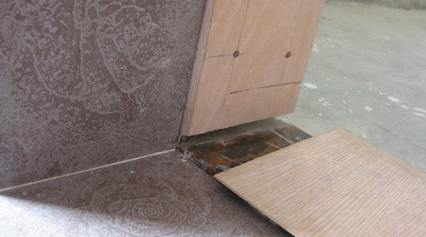 門套基層防潮工藝: 新建隔墻與地面的濕度不一樣,現(xiàn)場(chǎng)制作門套時(shí),需要在門套與新建 墻體間設(shè)置防潮膜、噴涂木材防水劑,廚房、衛(wèi)生間的門套基層板需 要離地15mm以防止水氣侵蝕 |