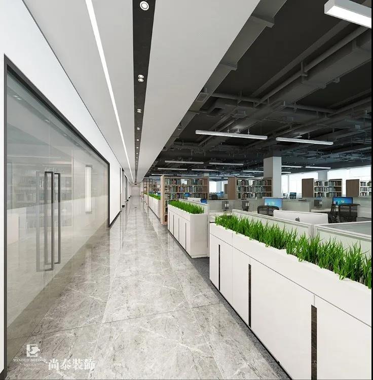 開放式辦公空間采用卡位布置,加上造型和燈光點(diǎn)綴,使空間寬敞明亮。