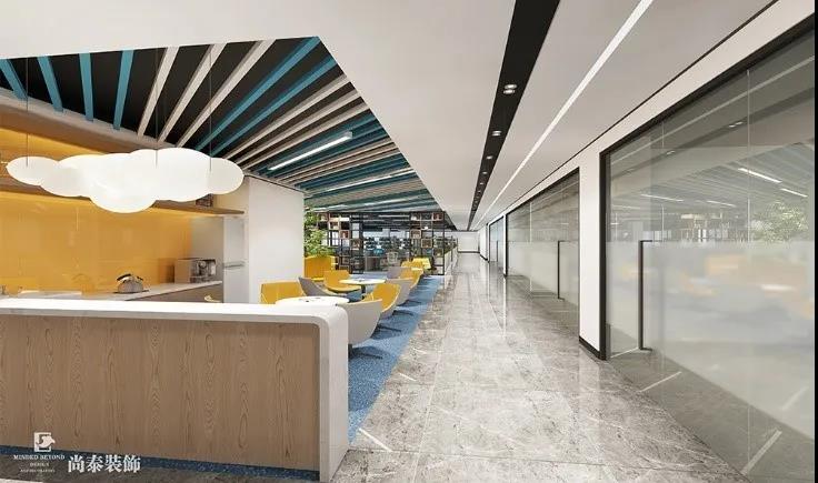 休閑區(qū)的設(shè)計(jì),最能體現(xiàn)公司年輕活力,科技前沿的企業(yè)文化屬性。設(shè)計(jì)以黑白灰為主色調(diào),配以黃橙色等活潑色彩,加上獨(dú)具創(chuàng)意的天花和地面造型,為員工營造出年輕活潑、自由愜意的休閑空間。
