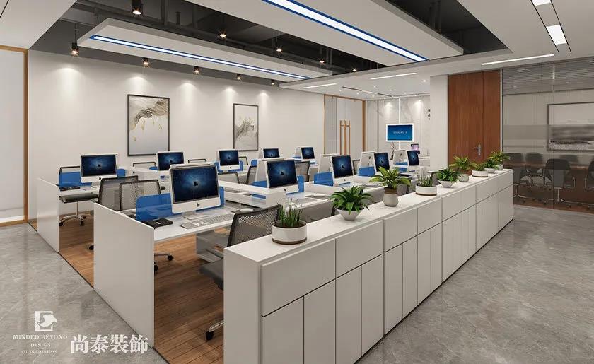 開放辦公區(qū)地面采用復(fù)合木地板,墻面刷上白色乳膠漆,天花使用白色乳膠漆的同時(shí)以一絲藍(lán)色乳膠漆點(diǎn)綴。以白色辦公家具裝飾空間,為員工營(yíng)造一個(gè)干凈舒適、方便高效的辦公環(huán)境。