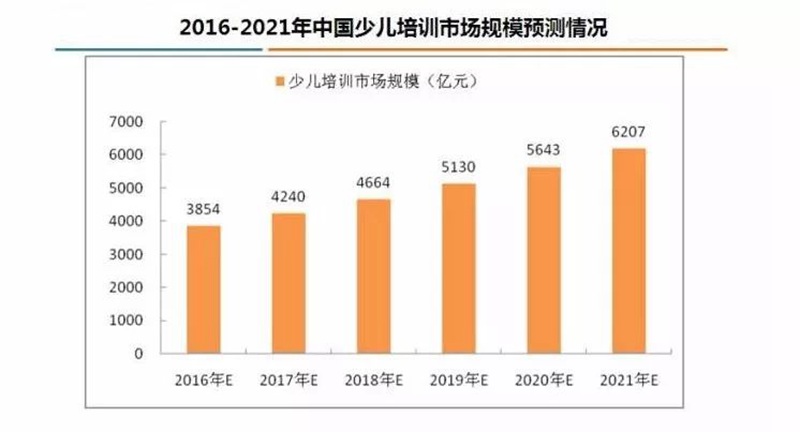 少兒培訓(xùn)已成為名副其實(shí)的“朝陽(yáng)產(chǎn)業(yè)”,其市場(chǎng)逐漸成為一塊令人垂涎的大蛋糕。未來(lái)幾年,該領(lǐng)域依然呈現(xiàn)快速增長(zhǎng)的趨勢(shì),中商產(chǎn)業(yè)研究院預(yù)測(cè),2016年中國(guó)少兒培訓(xùn)市場(chǎng)規(guī)模超過(guò)3800億元,保守估計(jì),每年將會(huì)以10%的速度增長(zhǎng),到2021年,中國(guó)少兒培訓(xùn)市場(chǎng)規(guī)模將突破6000億元。