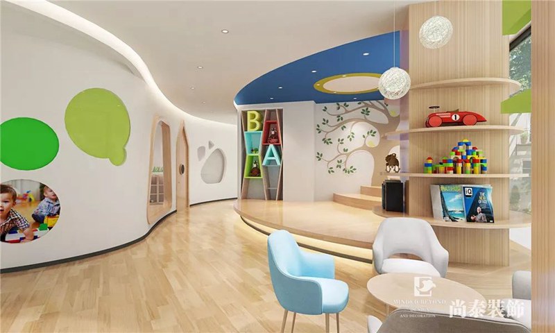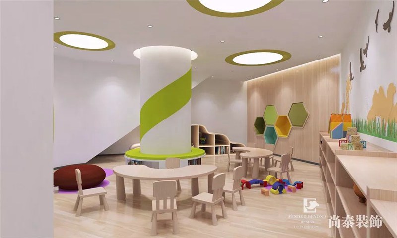 在富有藝術(shù)構(gòu)造的空間格局妝點(diǎn)五彩繽紛的環(huán)保乳膠漆,于簡(jiǎn)潔實(shí)用融入藝術(shù)的內(nèi)涵,加上適應(yīng)兒童生理與心理特征的家具與配飾,為孩子們營(yíng)造了無(wú)微不至的關(guān)懷及家庭般的氛圍。
